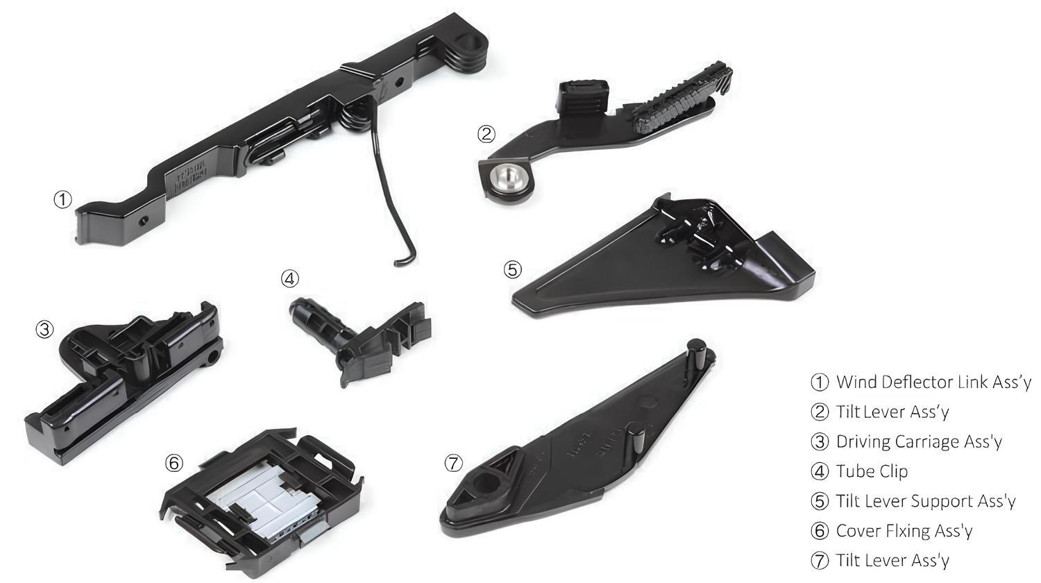 Sunroof Mechanisms: Wind deflector, tilt lever, driving carriage, decoration covers
